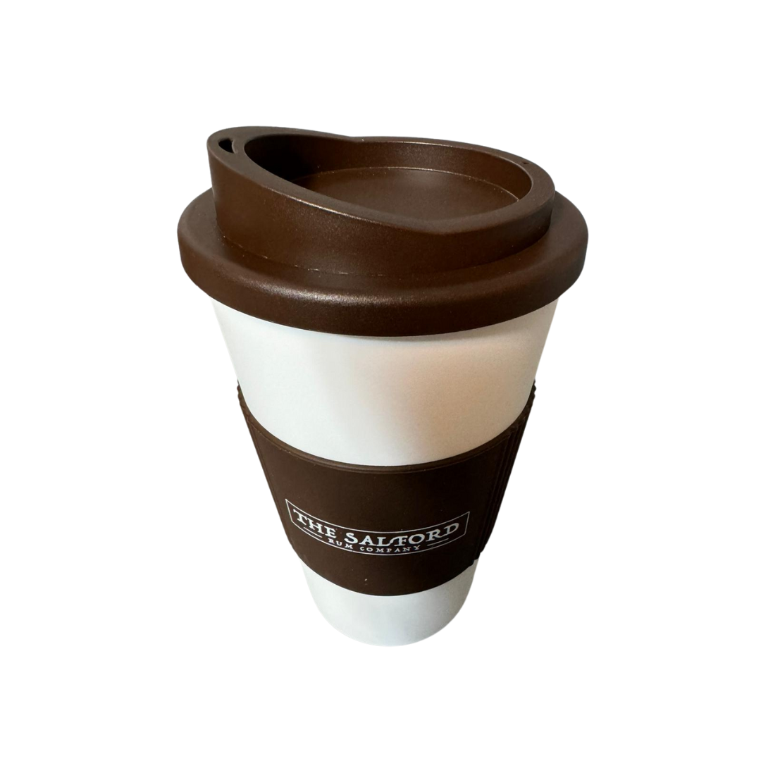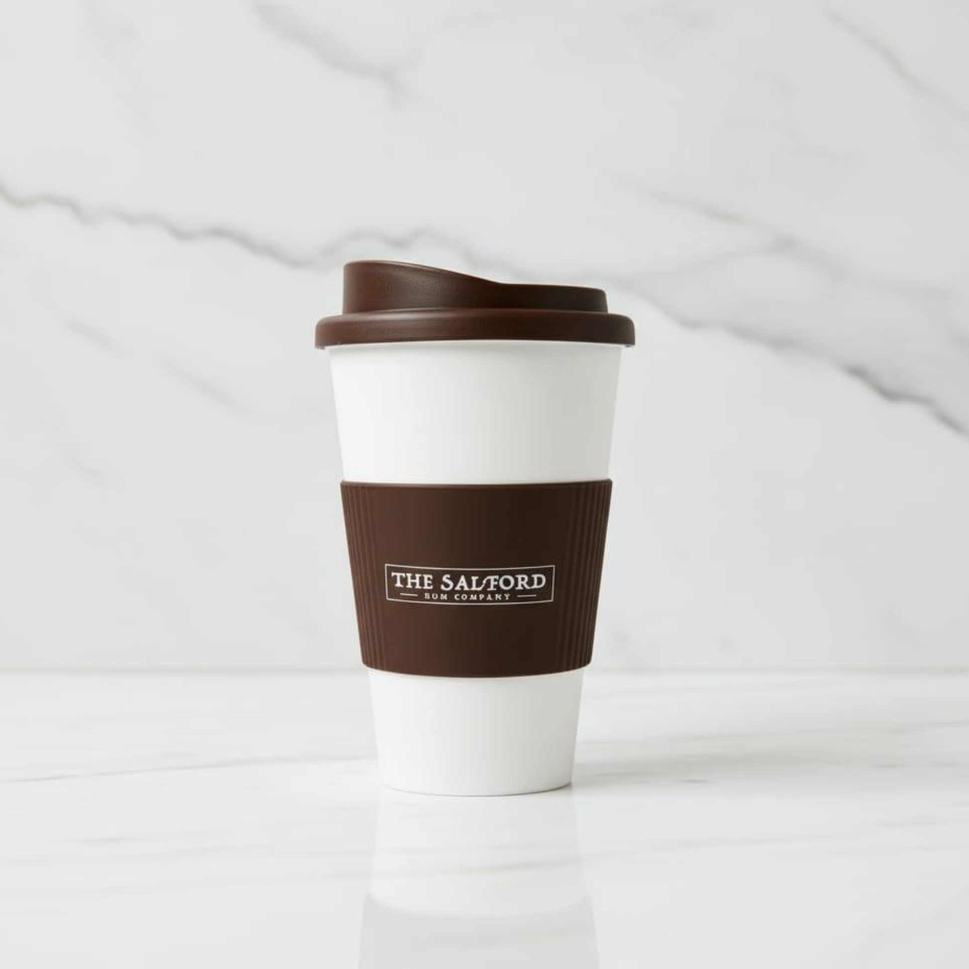 The perfect companion for our Coffee Rum. This 35cl white travel cup is double walled to insulate your hot drinks, with Salford Rum branded rubber grip and lid in brown.